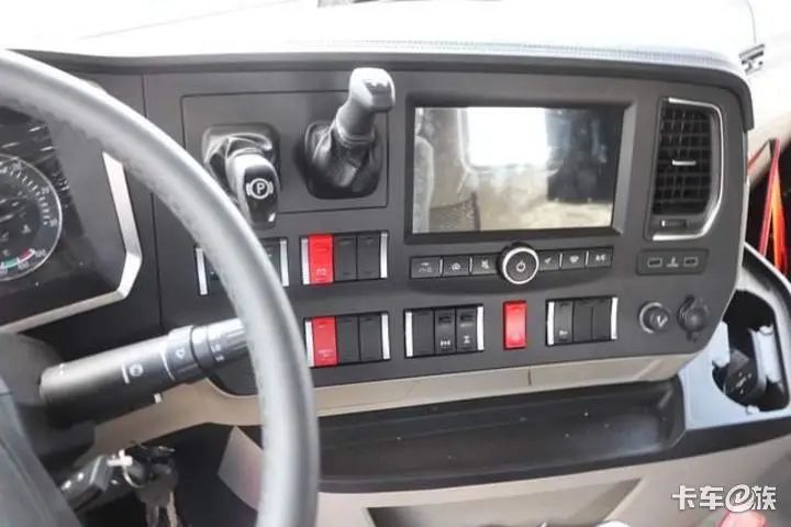 来到驾驶室,我们看到整车采用米白色与黑色的双拼内饰,整体营造出富贵典雅的感觉,环绕式驾驶台的布局,使得驾驶员对全局按键触手可及,不仅操作起来很方便,而且有助于行车安全。