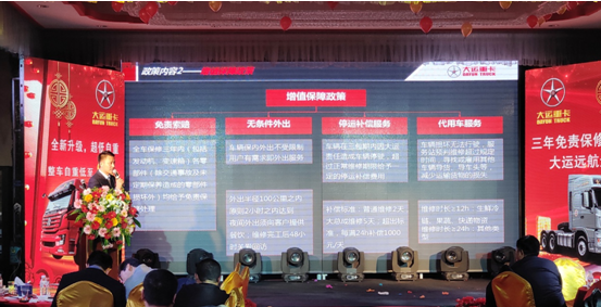 接下来,大运重卡销售部北区负责人年艳军经理详细讲解了“三年免责保修”服务政策,包括整车三年质保、免责索赔、无条件外出、停运补偿、代用车服务,引发了广大用户的由衷赞赏,他同时介绍了几款车型,其中N8V系列 400马力燃气车自重8.6吨(含备胎)吸引了全场目光。