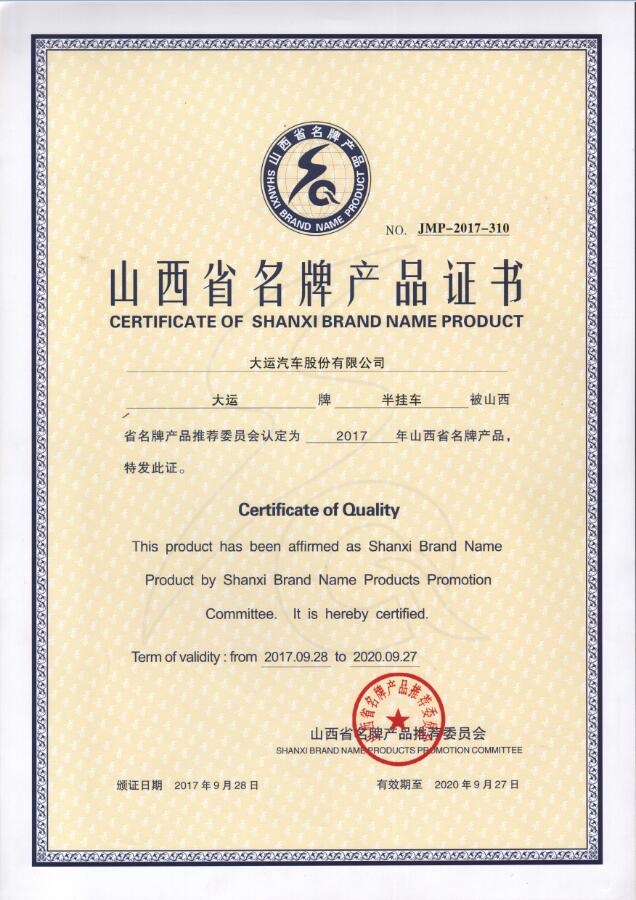 No.2 大运半挂车被山西省品牌产品推荐委员会认定为2017年山西省品牌产品