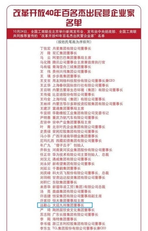 在改革开放40周年之际,为宣传民营经济发展巨大成就,展示民营企业家中国特色社会主义事业建设者风采,大力弘扬优秀企业家精神,鼓励广大非公有制经济人士“不忘创业初心,接力改革伟业”,为实现中华民族伟大复兴中国梦作出新的贡献,中央统战部、全国工商联决定推荐宣传改革开放40年百名杰出民营企业家。10月24日,全国工商联在北京举行新闻发布会,发布《改革开放40年百名杰出民营企业家名单》,大运九州集团有限公司董事长远勤山赫然在列。
