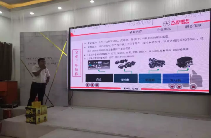 紧接着,大运重卡服务经理黄志新,针对大运汽车售后服务保障对各位来宾做了详细介绍,主要围绕“N9H高端牵引车,三年整车质保”和“大运重卡终身质保“两大方面为各位老板详细介绍了我们的服务保障,赢得了现场各位的连番称赞。