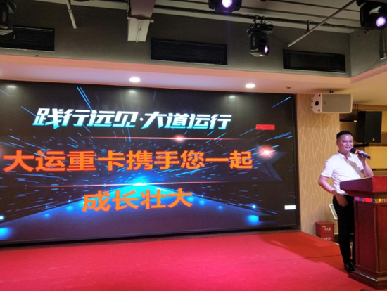 随后大运重卡大区经理姚鹏再次深情的表达了对用户的感恩之情。为用户讲述了大运重卡的发展历程,详细解读了终身质保服务政策,为现场用户介绍大运重卡推荐车型,并预祝各位来宾“开大运、行大运、交好运”。