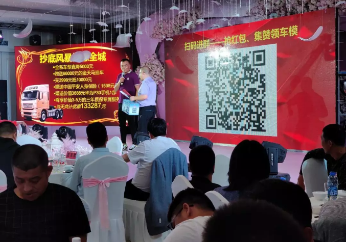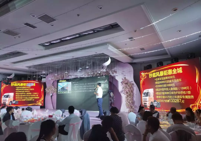 接下来,大运重卡东北大区经理张申上台为在座嘉宾做详细讲解。张经理介绍道,大运重卡不仅在营口地区已经排名第三,在全国范围的牵引车市场上也已经排名第六,未来发展潜力巨大。大运重卡外观造型线条流畅、美观时尚,配置细节彰显人性化,安全性更被行业公认。大运康明斯品系享受整车三年质保、停运补偿、代用车服务,三年之后终身质等保售后服务。同时还解读了现场订车倾情钜惠,现场观众纷纷赞叹优惠力度之大。