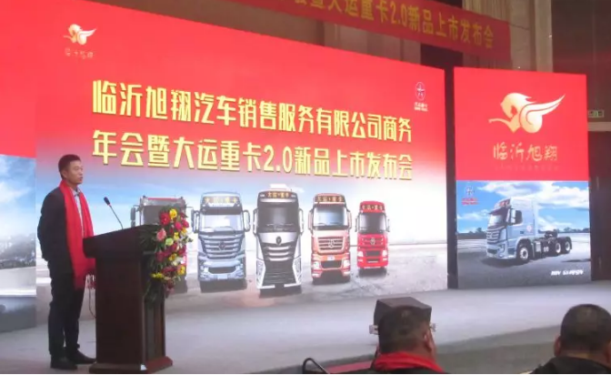 晚上6时,由临沂旭翔汽车销售服务有限公司举办的年会暨大运重卡2.0新品发布会正式拉开了帷幕。主持人对莅临本次会议的主要领导进行了介绍,分别有临沂旭翔汽车销售服务有限公司董事长孙志会、山西大运销售副总经理刘卓志、大运汽车山东办事处主任倪世界、省区经理栾泽涛、潍柴动力股份有限公司山东办事处于刚、法士特集团公司山东办事处主任山随征、大运汽车苏鲁沪大区服务经理窦军峰。