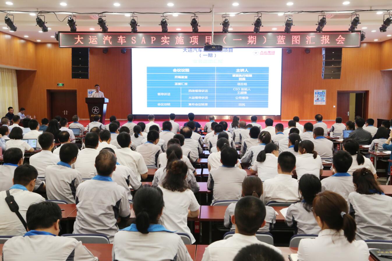 6月16日下午,大运汽车SAP实施项目(一期)业务蓝图汇报会在大运汽车重卡生产基地办公楼12楼多功能厅隆重召开。大运集团董事长远勤山,大运汽车董事、山西大运制造总经理陈澔利,大运汽车董事、山西大运销售总经理姜宇翔等公司领导,西信CEO王超锋出席会议,西信顾问团队、SAP项目组成员、大运各业务板块相关人员参会,SAP项目组执行经理田民主持会议。