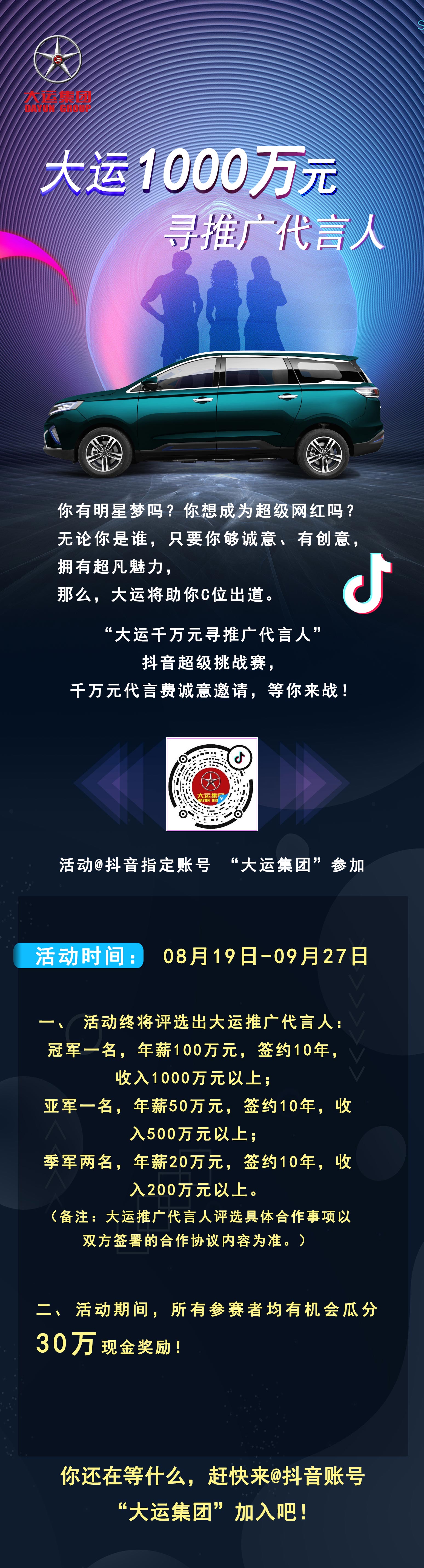 “大运千万元寻推广代言人” #抖音超级挑战赛# 火热来袭!大运集团10年1000万元,高薪请你来做推广代言人,诚意邀请,等你来战!