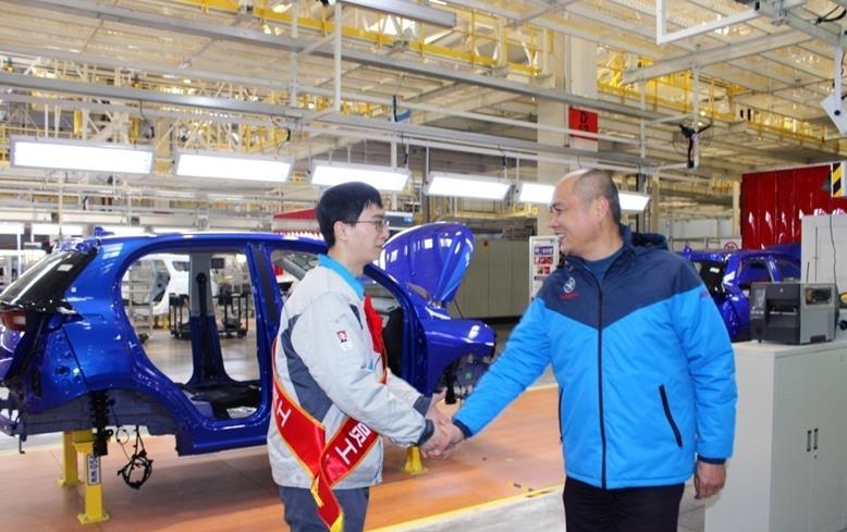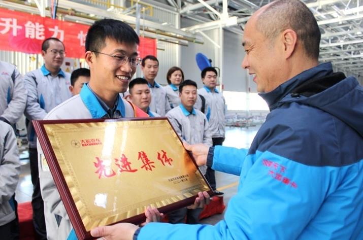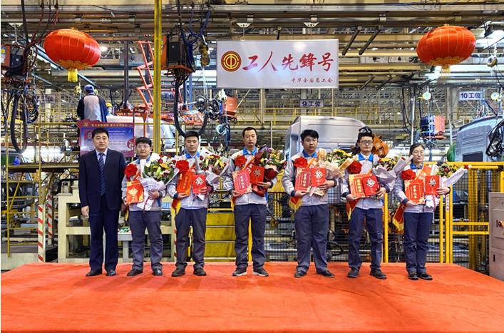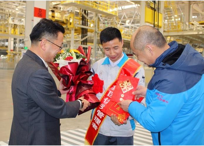 大运汽车乘用车事业部总经理陈澔利、重卡服务中心副总经理王敬东一行在新能源汽车生产基地为该区域的先进集体、优秀个人颁奖,陈总一行先后来到了乘用车技术中心、四大生产车间、员工餐厅,为大家送上荣誉的同时,也给大家送去了节日关怀,在大家的欢笑和掌声中,陈总与各获奖集体、个人在工作一线合影留念。