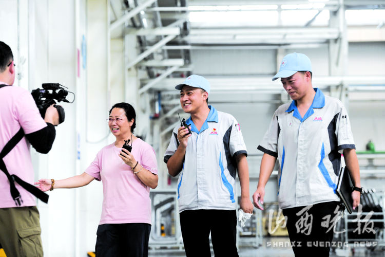 采访团在大运集团进行直播,乘用车技术中心副总助理王震(右一)与冲焊部负责人李云广(右二)为网友做介绍。