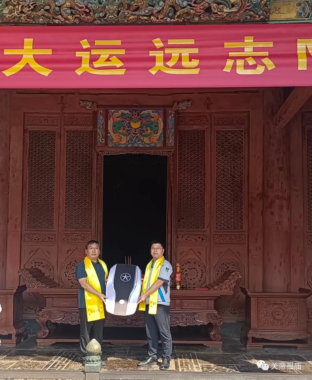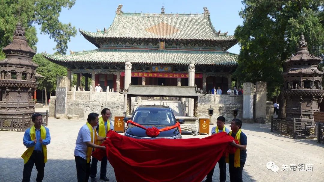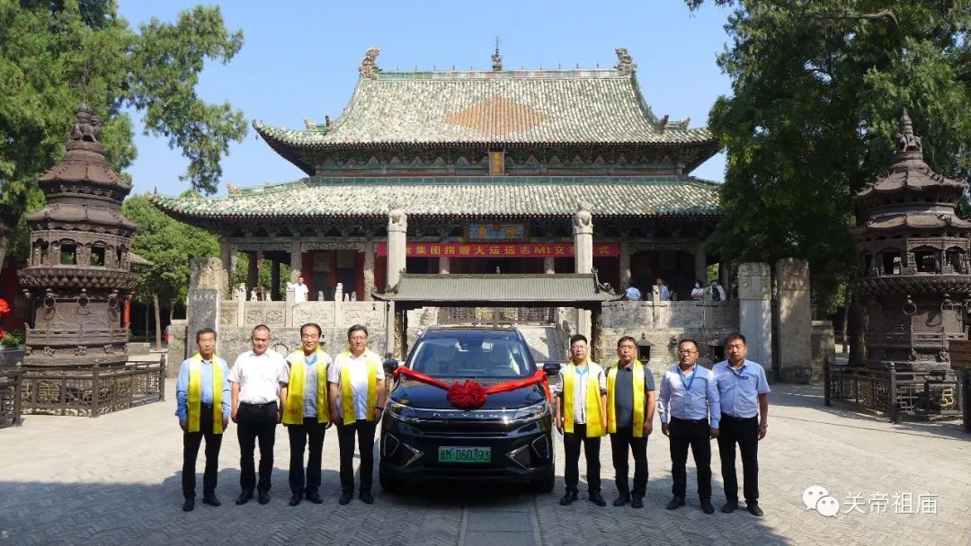 壬寅仲秋,文化盛会;大运集团,公益捐赠。为进一步传承弘扬中华优秀传统的关公文化,助力山西省第八次旅游发展大会暨山西运城第33届关公文化旅游节,2022年9月15日上午,山西大运集团宇润房产开发有限公司向运城市解州关帝庙文物保护所捐赠一辆大运远志新能源车。运城市文保中心主任卫龙、解州关帝庙文保所所长傅文元、大运集团副总经理郭进峰、大运集团办公室主任吴德峰出席了在崇宁殿的捐赠仪式。副所长郭波主持。